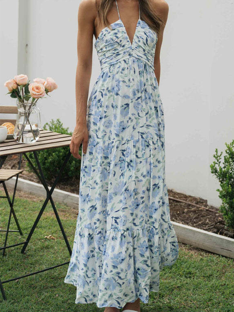 Onbely Robe longue mousseline imprimé à fleurie licou dos nu vacances